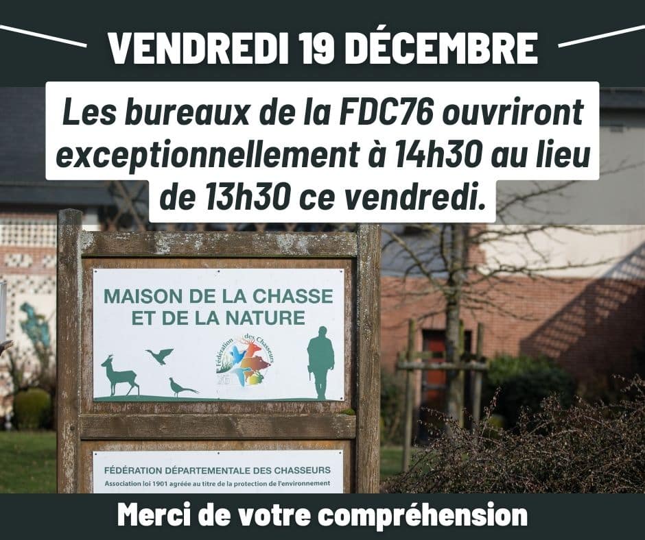 Les bureaux de la FDC76 ouvriront exceptionnellement à 14h30 au lieu de 13h30 ce vendredi. 18 décembre 2025 Actualités ChassAdapt : la déclaration de vos prélèvements n’a jamais été aussi simple ! 04 décembre 2025 Actualités | Chasser en 76 | Règlementation Nouveau cas d’Influenza Aviaire Hautement Pathogène à Bosville : mise en place d’une zone réglementée et mesures pour les activités cynégétiques 21 novembre 2025 Actualités Toutes les actualités